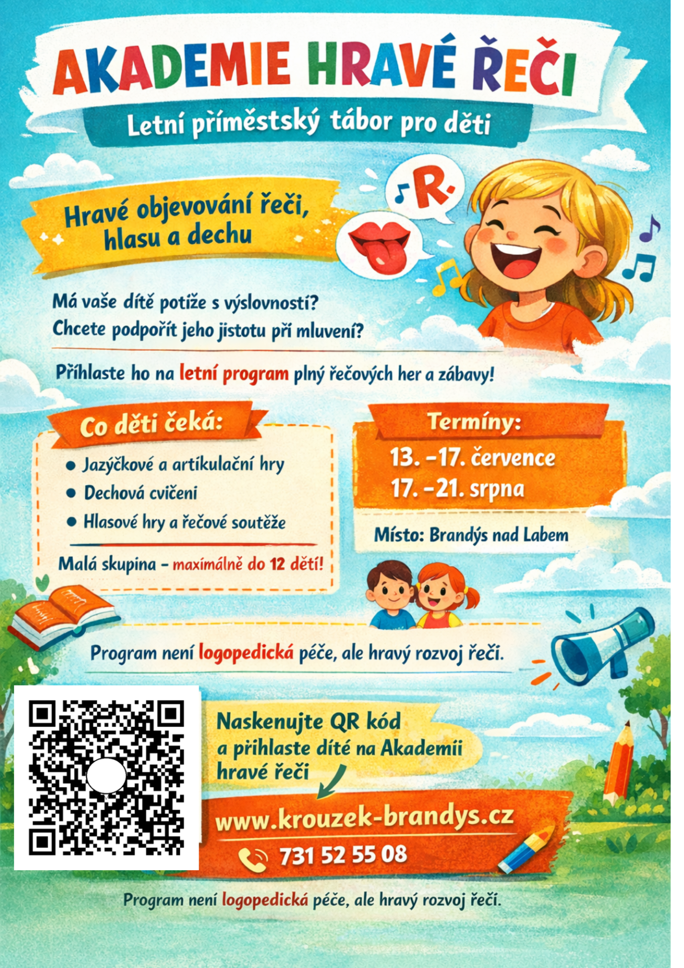 Akademie hravé řeči je letní příměstský tábor pro děti, které chtějí s lehkostí a radostí rozvíjet svou řeč, hlas i dech. Během pěti dnů budeme společně objevovat, jak funguje řečový aparát, jak zapojit jazyk, rty a dech při mluvení a jak si s řečí hrát tak, aby děti získaly větší jistotu v komunikaci.